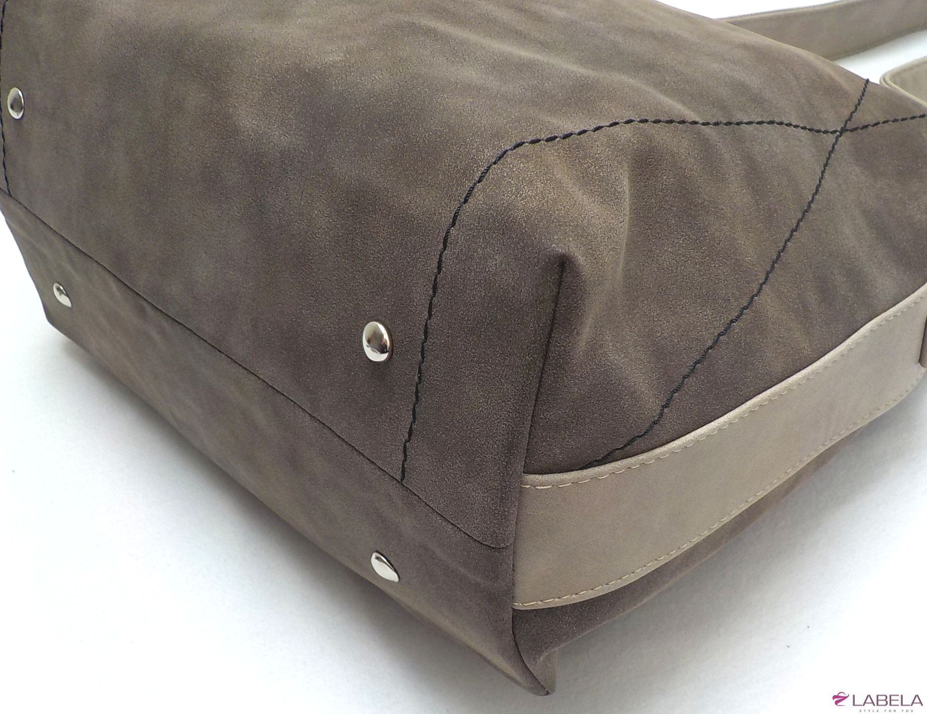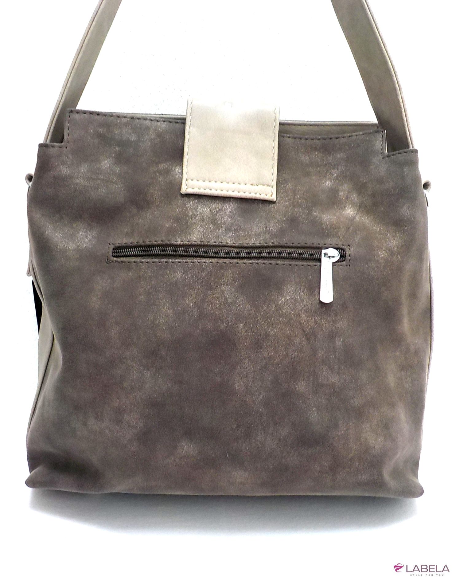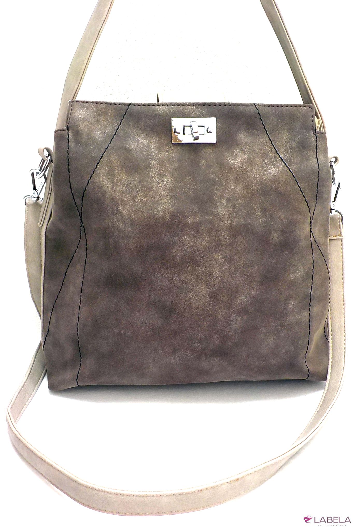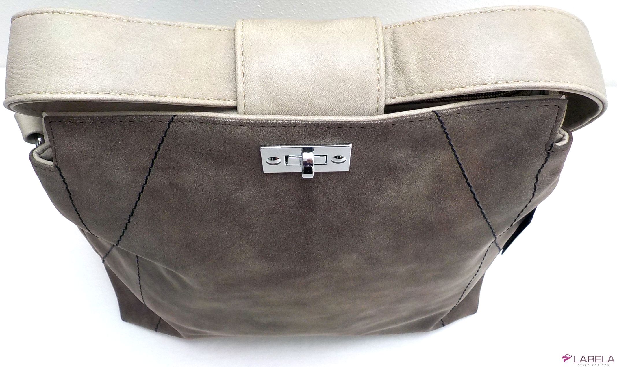 Velice módní kabelka STELLA v zajímavém designu je vyrobena ze syntetické broušené hnědé kůže. Na přední straně po stranách je prošívaná a její celkový vzhled dotváří širší držadlo (š.4cm) v béžové barvě. Může se nosit v ruce i na rameni, součástí je i nastavitelný popruh.Kabelka má uvnitř jednu kapsu na zip a dvě na drobnosti. Uprostřed je látková přepážka uzavíratelná na zip a na vnější zadní straně jedna zipová kapsa. Její vlastnosti oceníte při každodenním nošení.